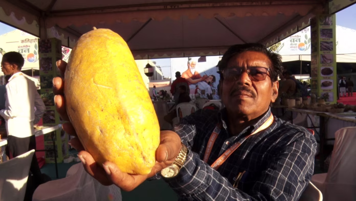 अनूपपुर से आए प्रगतिशील किसान सेवक राम मरावी बताते हैं कि “यह हाईब्रिड नहीं, बल्कि 100 फीसदी देसी लौकी है. अभी इसकी लंबाई कम है, यह करीब साढ़े 7 फीट तक लंबी हो जाती है. इसी तरह सफेद लौकी का वजन भी 7 किलो तक होता है.”