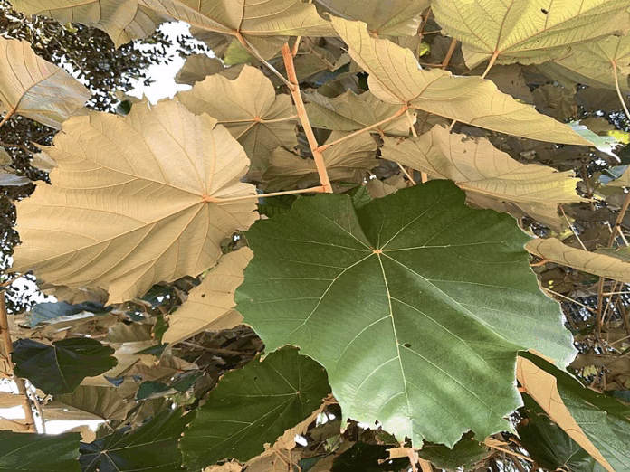 फरवरी के अंतिम सप्ताह में ये बड़े-बड़े पत्ते अपने आप खिर जाते हैं जो हवा में इधर-उधर बड़ी मात्रा में उड़ते रहते हैं। इसके बड़े, लंबे-चौड़े पत्ते मुझे हमेशा लुभाते हैं। कुछ पत्ते तो एक फीट से भी ज्यादा लंबे-चौड़े होते हैं। फूलों का मखमलीपन भी कम नहीं है। पत्तों और फूलों की इन खासियतों के चलते इसका नाम पता लगाना अब तो बहुत ही जरूरी हो चुका था।